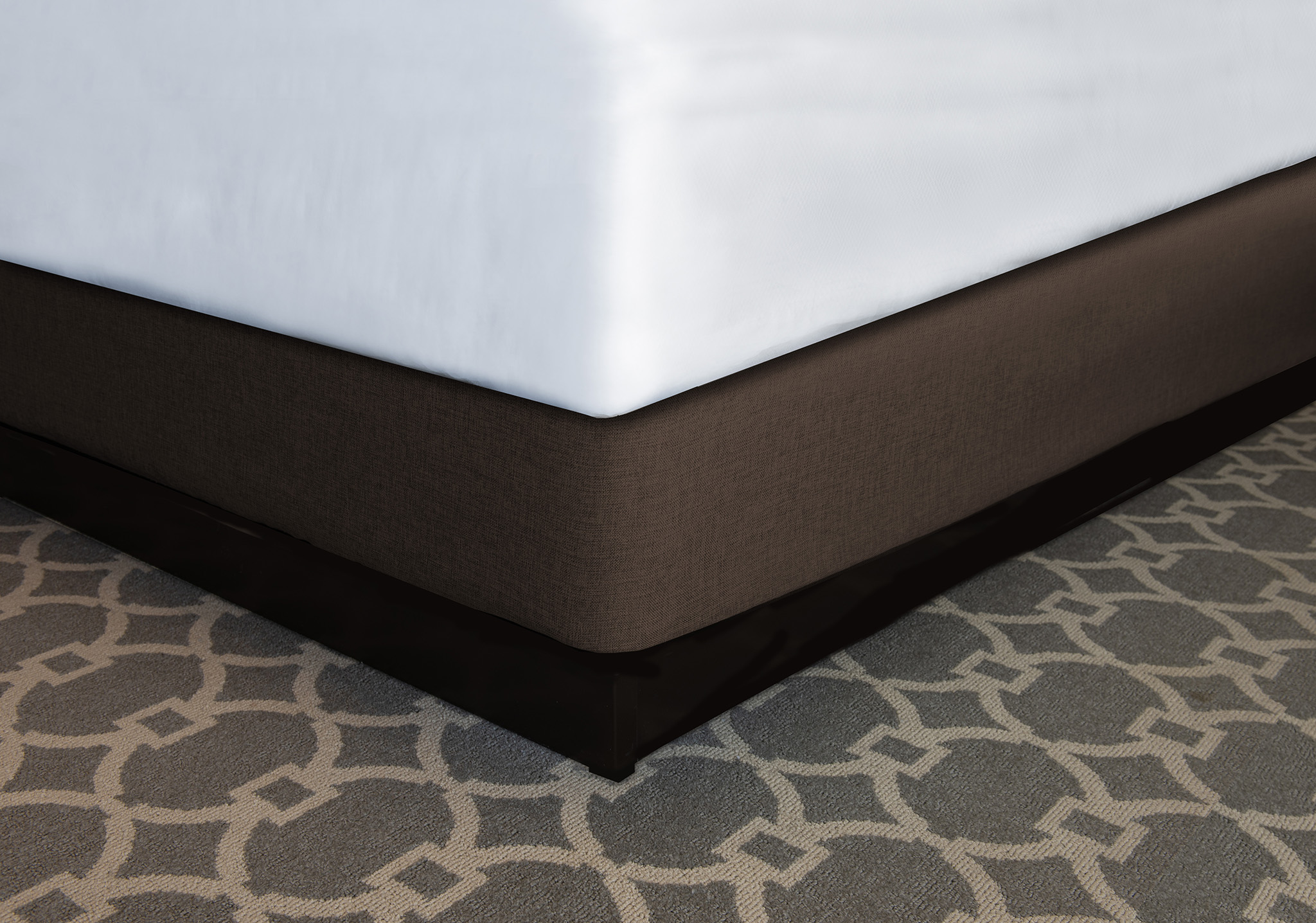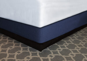 A designer fabric sidewall is held in place with a stretch knit decking on top and elastic edging under and around the bottom of the box spring to create a secure fit.